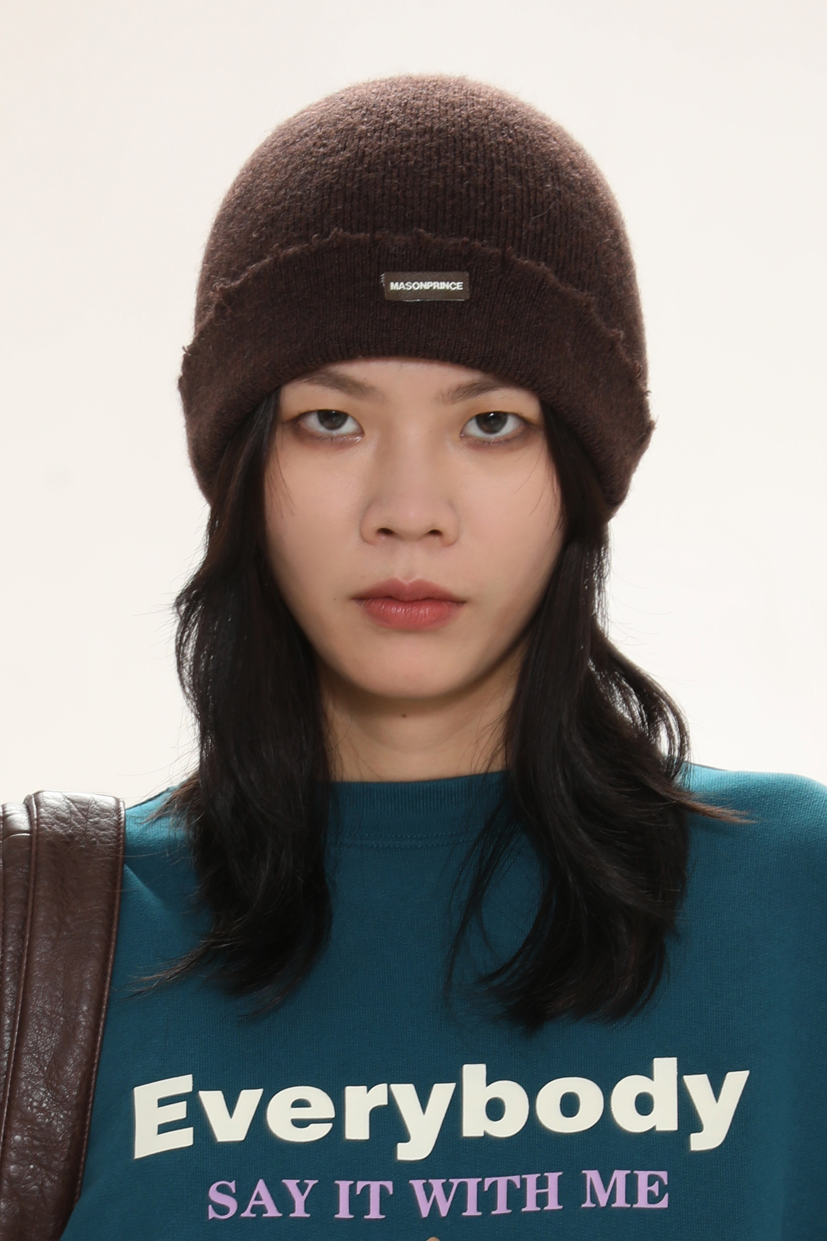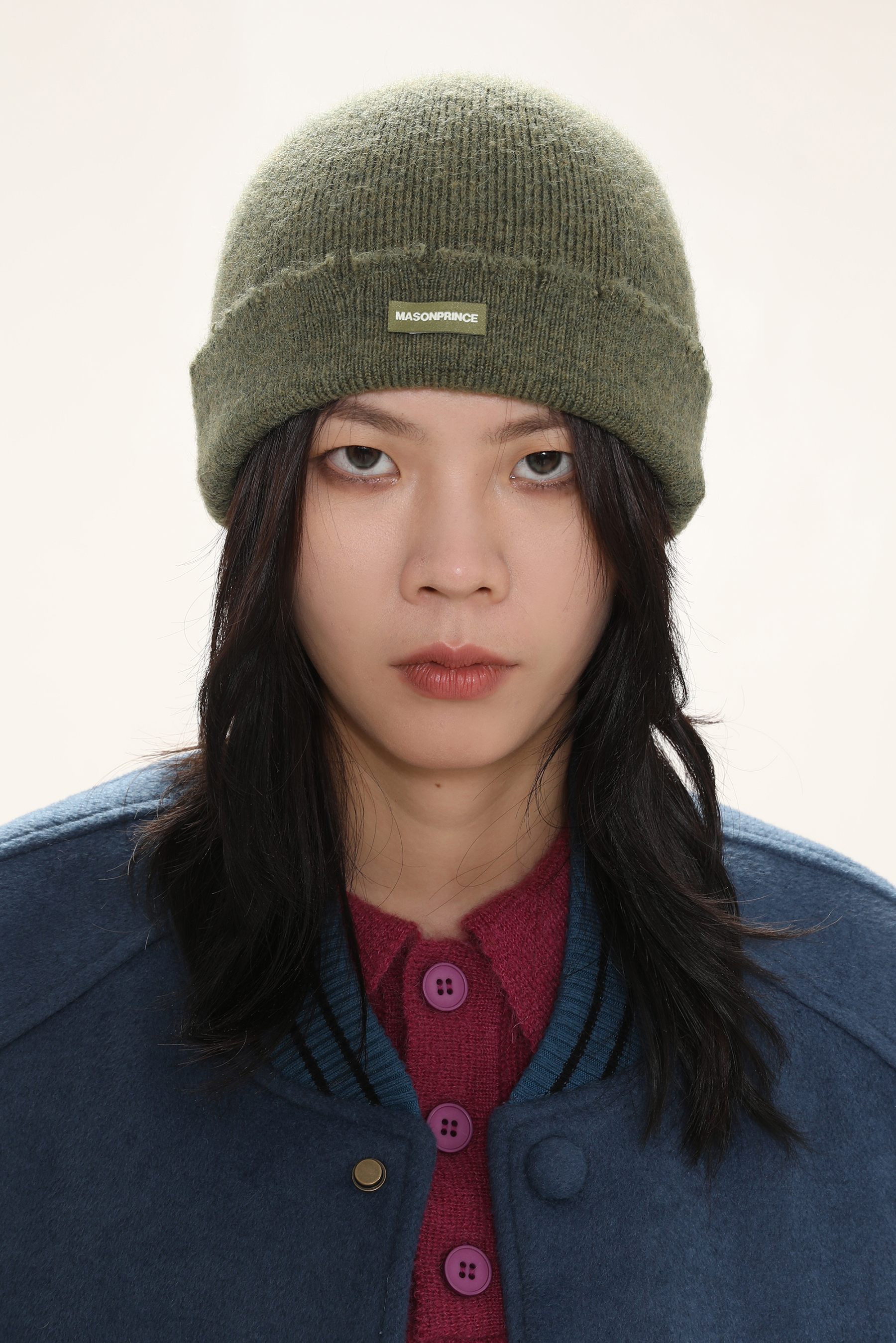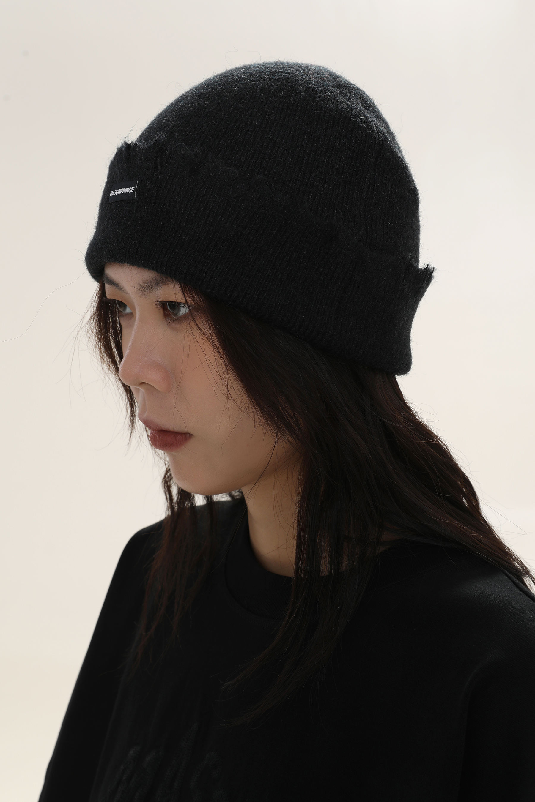 This beanie showcases a minimalist street-style look with a soft fuzzy knit, raw-edge seam detailing, and a folded cuff accented by a sleek metal “MASONPRINCE” logo plaque.