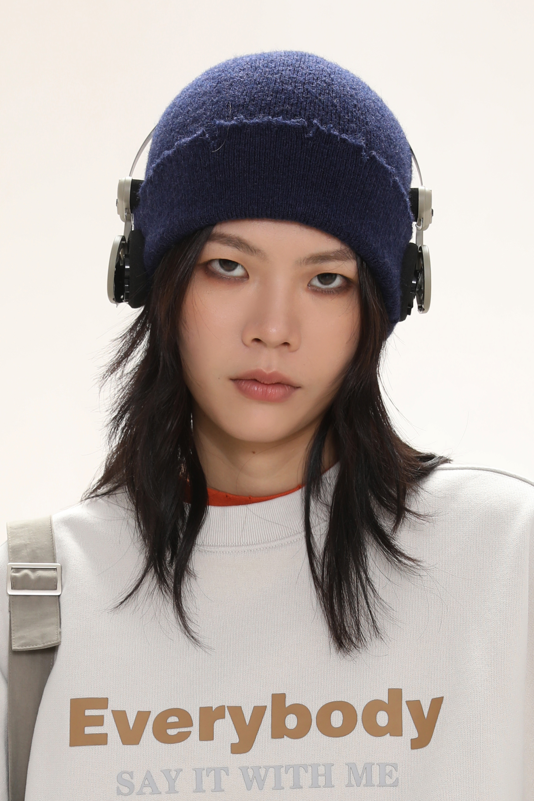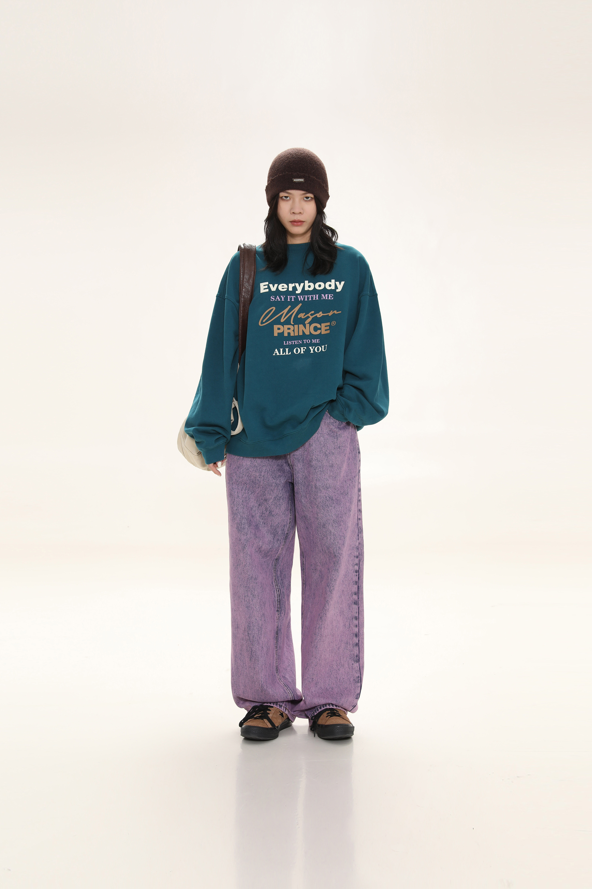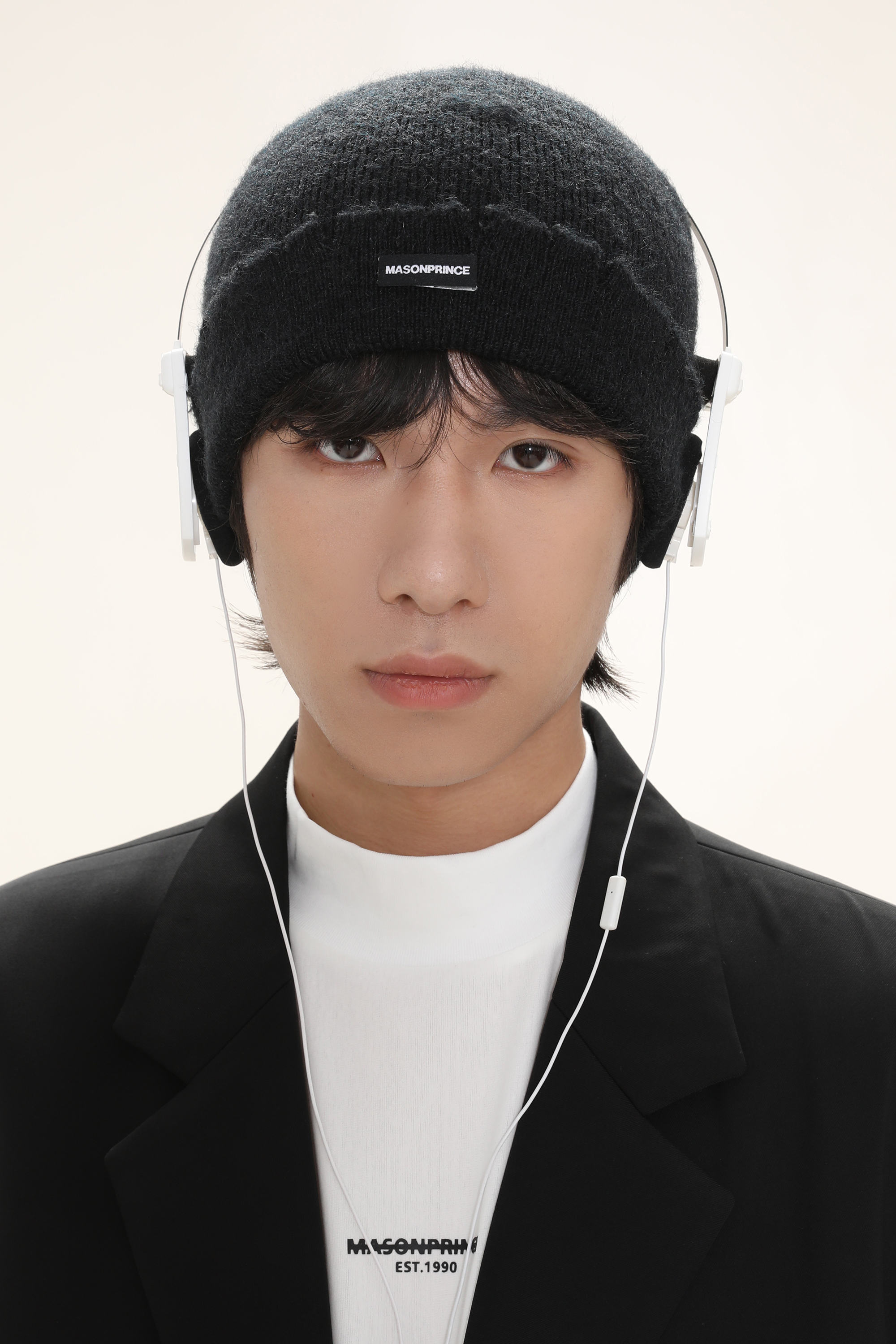 This beanie showcases a minimalist street-style look with a soft fuzzy knit, raw-edge seam detailing, and a folded cuff accented by a sleek metal “MASONPRINCE” logo plaque.